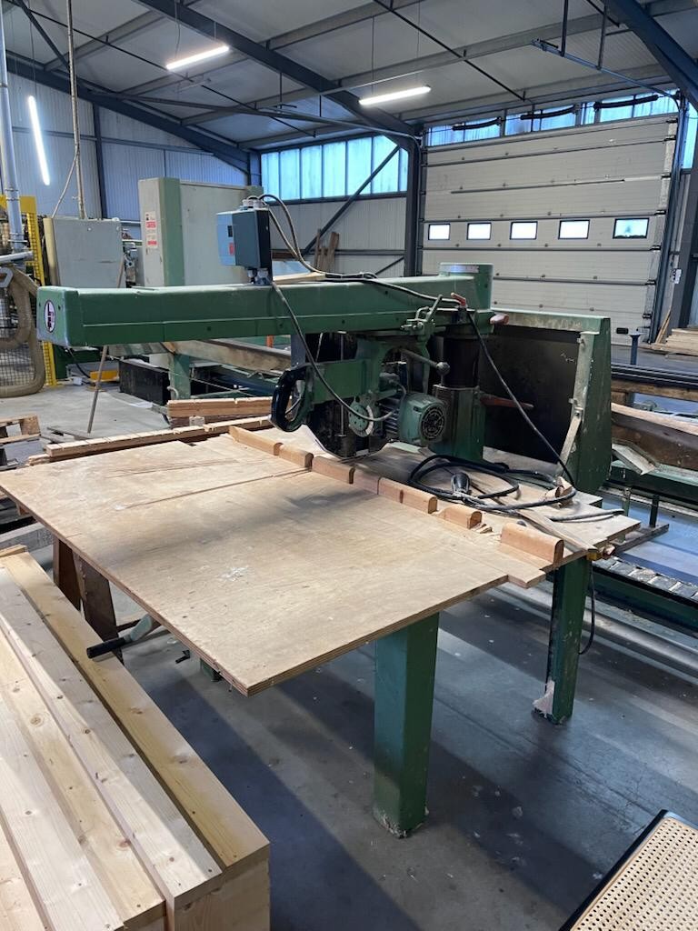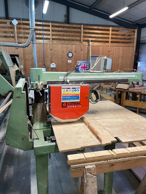 Scie radiale marque Lyonlex, type RD 130. Avec protection. Table refaite.